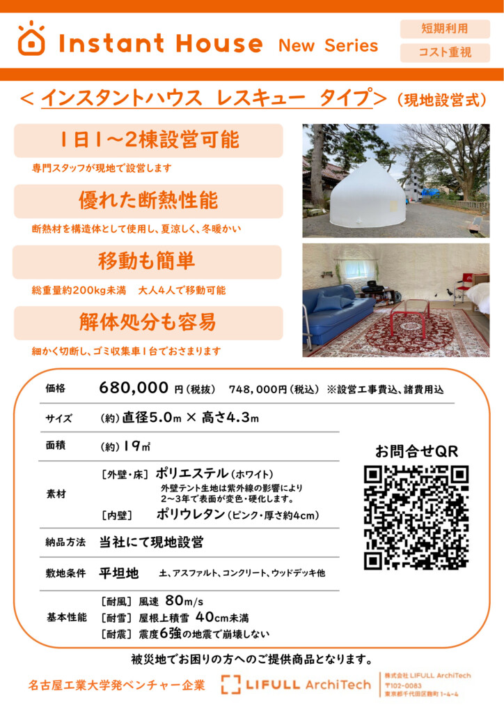 そんな中で名古屋工業大学の北川教授とご縁をいただき、世界中からの寄付金でインスタントハウスを無償提供されているということで、私たちも仕事を通じて被災された方にお役立てすることが出来ました。